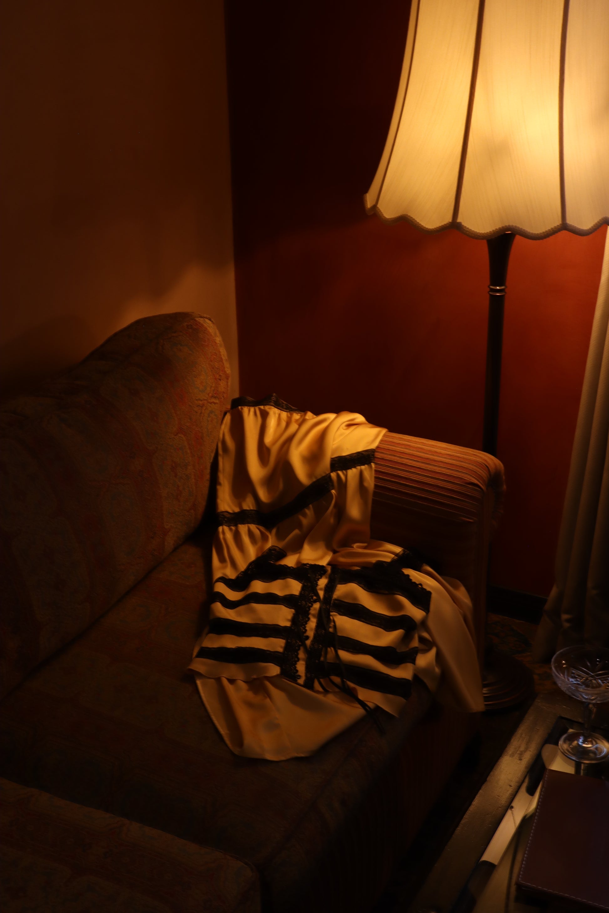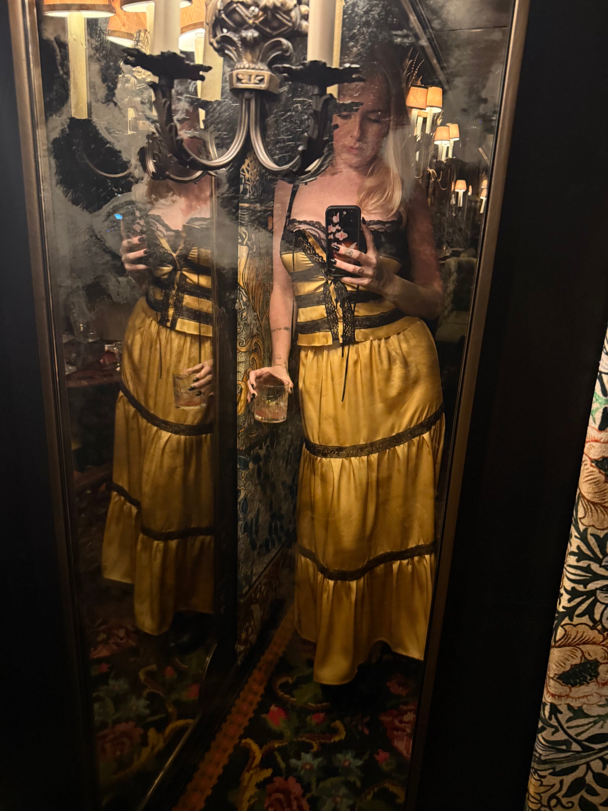 Golden satin and contrasting black lace make the vintage-inspired Echo in the Canyon Top. Designed with a mid-waist crop, plus button & ribbon front closure that adds both structure and softness.