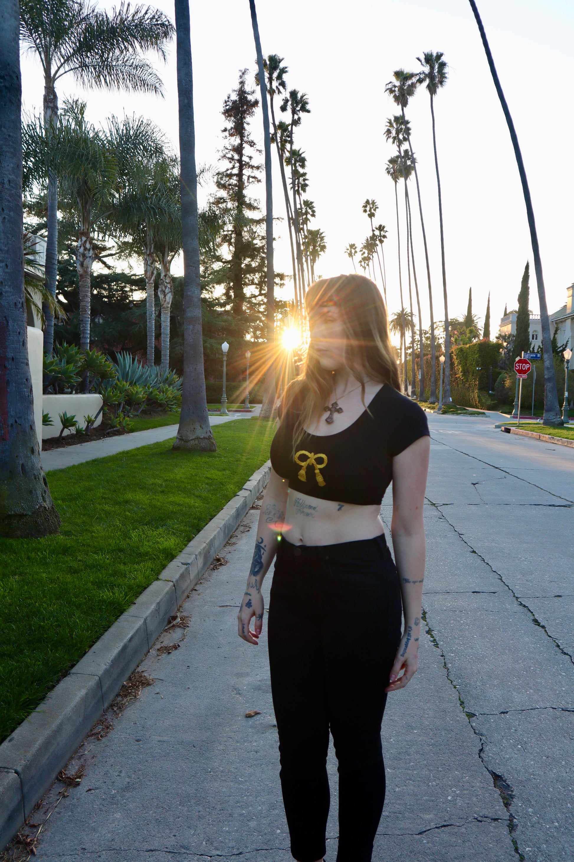 Our Petit Starlet Top, a mini baby tee made of heavyweight cotton elastane. With generous stretch and a youthful under-bust crop. Embroidered with our signature Gilded Bow.
